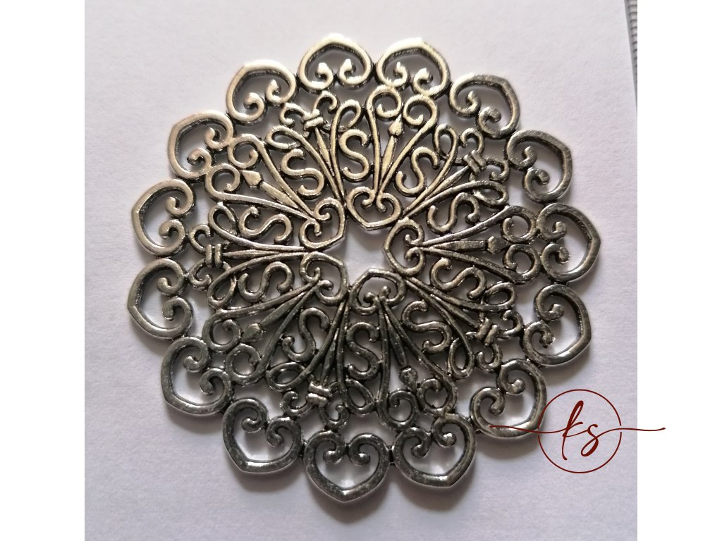 Nádherný masivní filigránový kovový výřez ve tvaru květu se srdíčky ve stříbrné barvě.